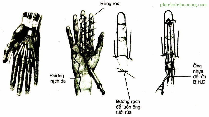 - Đường rạch đi suốt chiều dài ngón. Đường rạch da là đường liên tục, còn đường rạch bao hoạt dịch là đường gián đoạn, để lại các dây chằng vòng nhẫn ở vùng này.